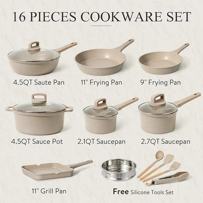 I remember the day the CAROTE 16-piece set arrived. The box was bigger than I expected, but when I cracked it open, the taupe granite finish immediately caught my eye. It looked surprisingly sleek, almost more expensive than it was. My first thought was, "Okay, let's see if these actually live up to the hype." I pulled out the largest frying pan, a 10-inch beauty, and was genuinely surprised by its lightness – it felt solid but not unwieldy, weighing in at just under 3 pounds. This wasn't the flimsy stuff you sometimes get with budget sets; it had a decent heft. I was eager to get it on the stove and put that non-stick claim to the test, wondering if this was the cookware that would finally make breakfast eggs a breeze, or if I'd be scraping burnt bits off by week two.